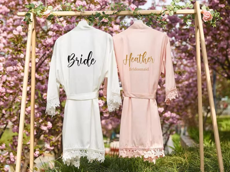 Elevate your bridal party’s style with our High Quality Lace Ruffled Kimono-Style Bridal Robes. Made from silky, flowing material, these robes offer a relaxed, flattering fit with a loose tie at the waist for comfort. Available in a variety of colours, they can be personalised with custom text on the back, making them a unique and memorable gift for your bridesmaids. Perfect for pre-wedding moments and beyond!