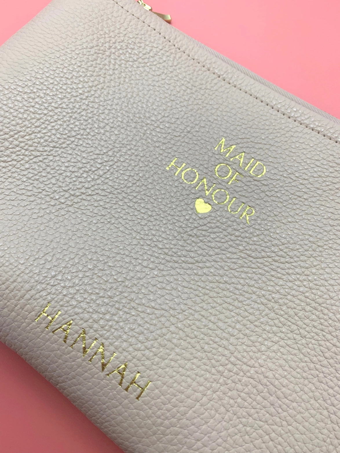 From hen do to the wedding day, the bridal party will fall in love with their clutch bag! Handmade in the UK from super soft leather, the bridal party clutch bags are made from a versatile blush leather and a stunning ivory leather for the bride with a light blue lining for the bride's 'Something Blue'. Maid of Honour, Bridesmaid and Mother Of The Bride Clutch bags feature a super versatile blush leather with light grey cotton lining.