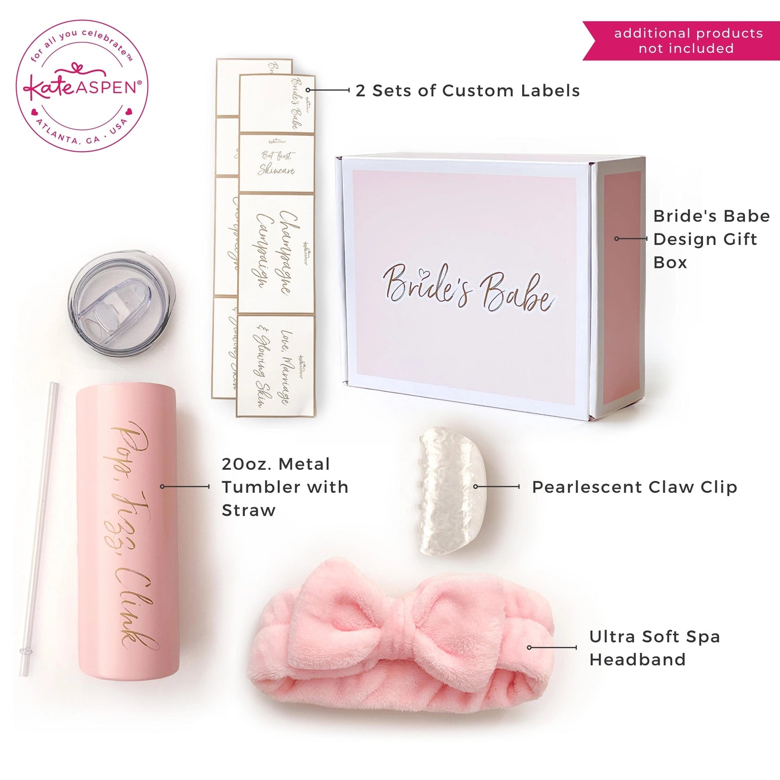 The "Bride's Babe" Bridesmaid Gift Box Kit makes the perfect gift. We especially curated the Bride's Babe Bridesmaid Gift Box Kit that features a blush pink box with white edging, an exterior print of "Bride's Babe" and an interior print of "I can't say I do without you". Inside we include a spa headband for all that skin prep before the wedding and a claw clip that we all need more of great for all hair types. A metal tumbler that reads "pop, fizz, clink" down the side that is great for cocktails or mocktails and will keep your drink cold for hours. It also comes with labels that you can put on other gifts making it a more complete gift box.