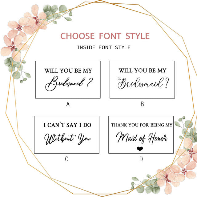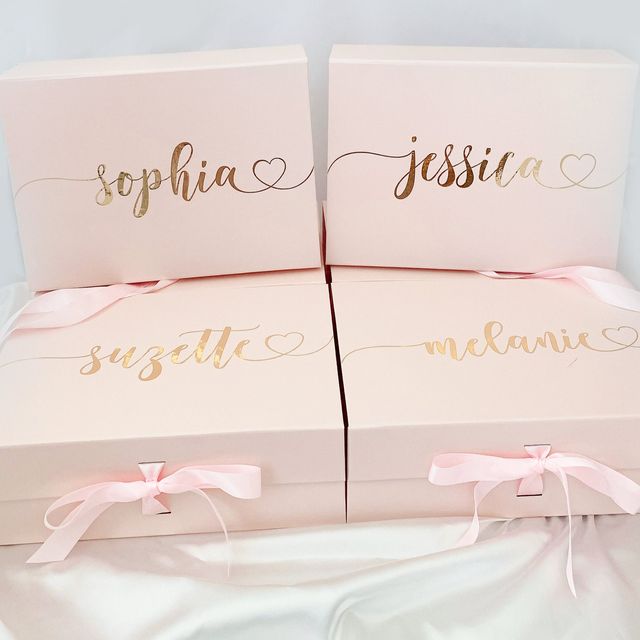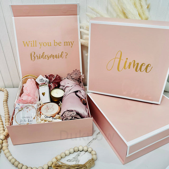 Show your appreciation with our custom Bridesmaids Gift Boxes, perfect for giving your bridal party a personalised touch. Made from sturdy cardboard, these elegant boxes can be personalised with your desired printed text to make each gift extra special. Whether you're planning a wedding or searching for the perfect wedding favors, these custom gift boxes are an ideal way to thank your bridesmaids in style. Designed to hold all your wedding day essentials, these beautiful boxes add a personal, thoughtful element to your wedding planning.