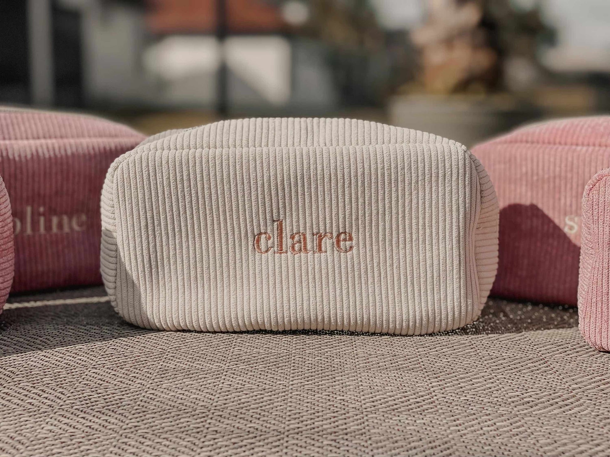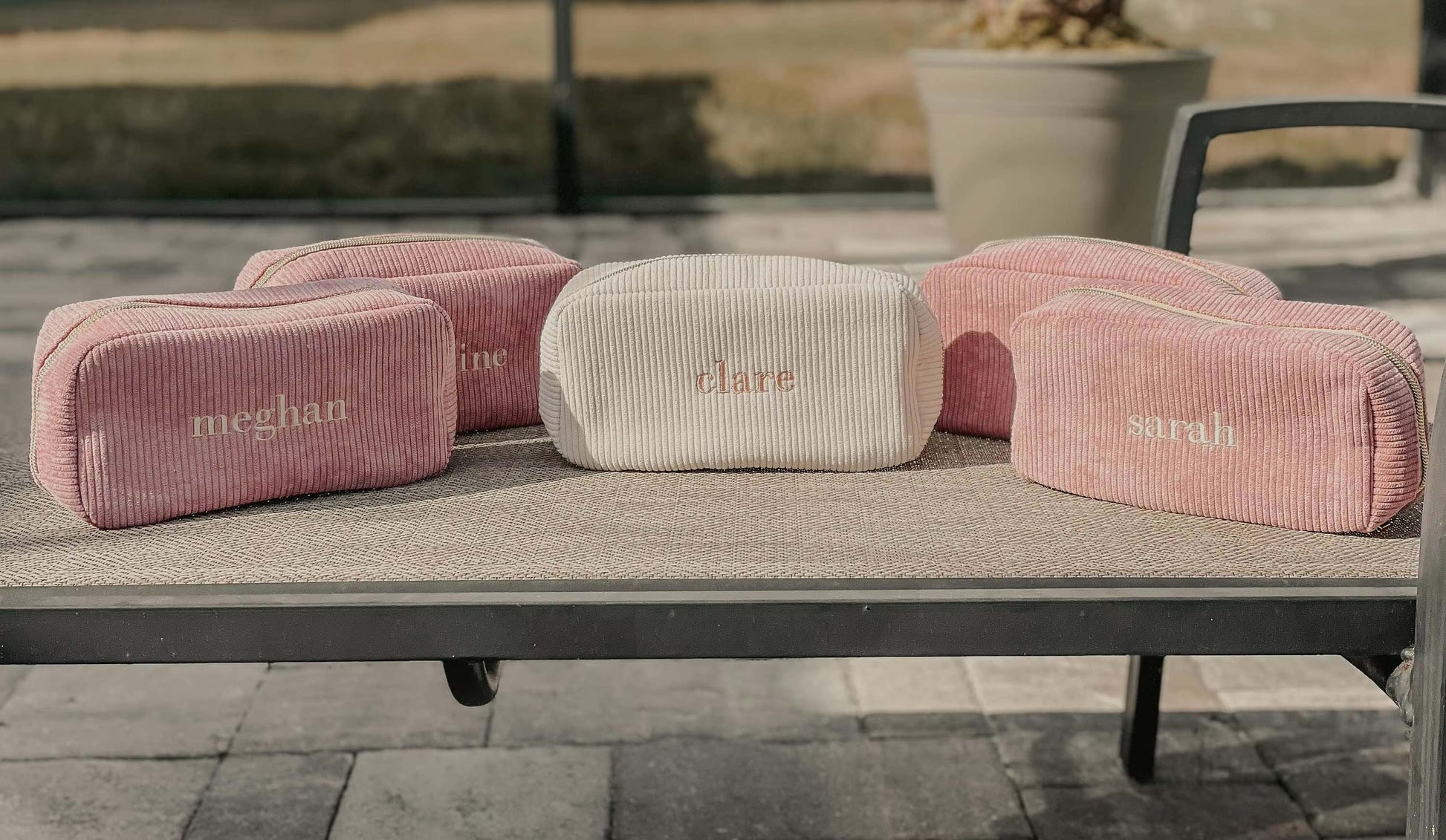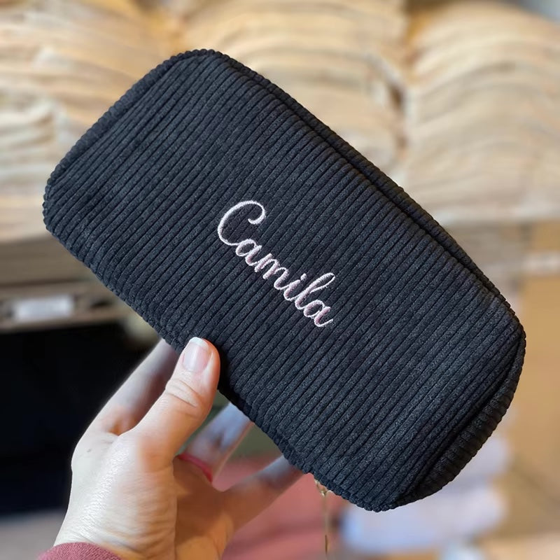 Introducing our embroidered corduroy cosmetic bags, the perfect blend of style and functionality! Ideal for storing makeup or travel essentials, these bags feature a gold zipper hardware and come in elegant black, beige, and light pink finish. Each bag is personalised with your desired names in our chic shadow block font, making them perfect gifts for bridesmaids, bachelorette parties, or any special occasion. With one large inside pocket and crafted from beautiful, sturdy corded fabric, these bags are both fashionable and practical making them ideal gifts on your wedding day.
