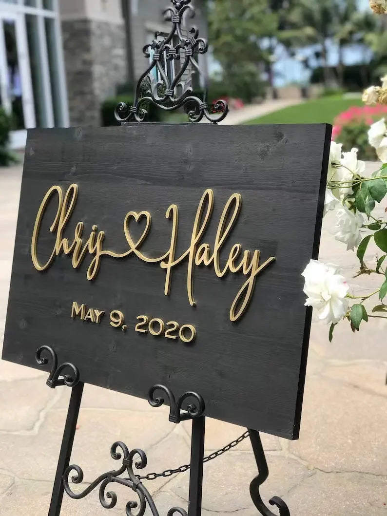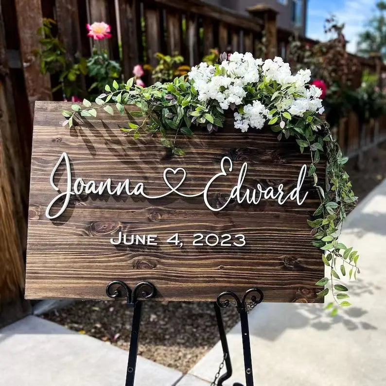 Welcome your guests in style with our carved 3D elegant solid wood sign, complete with a sturdy wooden stand. This charming piece can be personalised with your names and wedding date plus any other information you desire, adding a sophisticated touch to your ceremony.