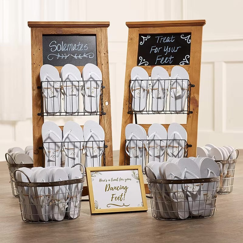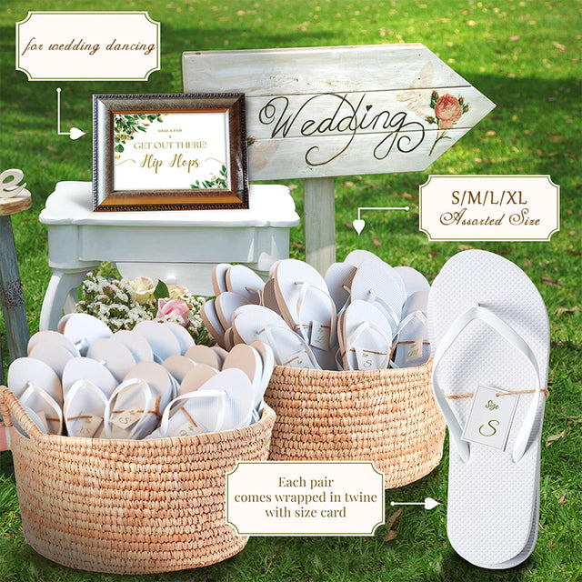 Ensure your guests are ready to dance the night away in comfort with these stylish and practical wedding flip flops. Perfect for providing relief from heels, these flip flops are a thoughtful addition to any wedding reception, letting guests kick off their shoes and hit the dance floor in comfort. Each pair is beautifully tied with twine and includes a size card, adding a charming touch that complements any wedding or party décor.