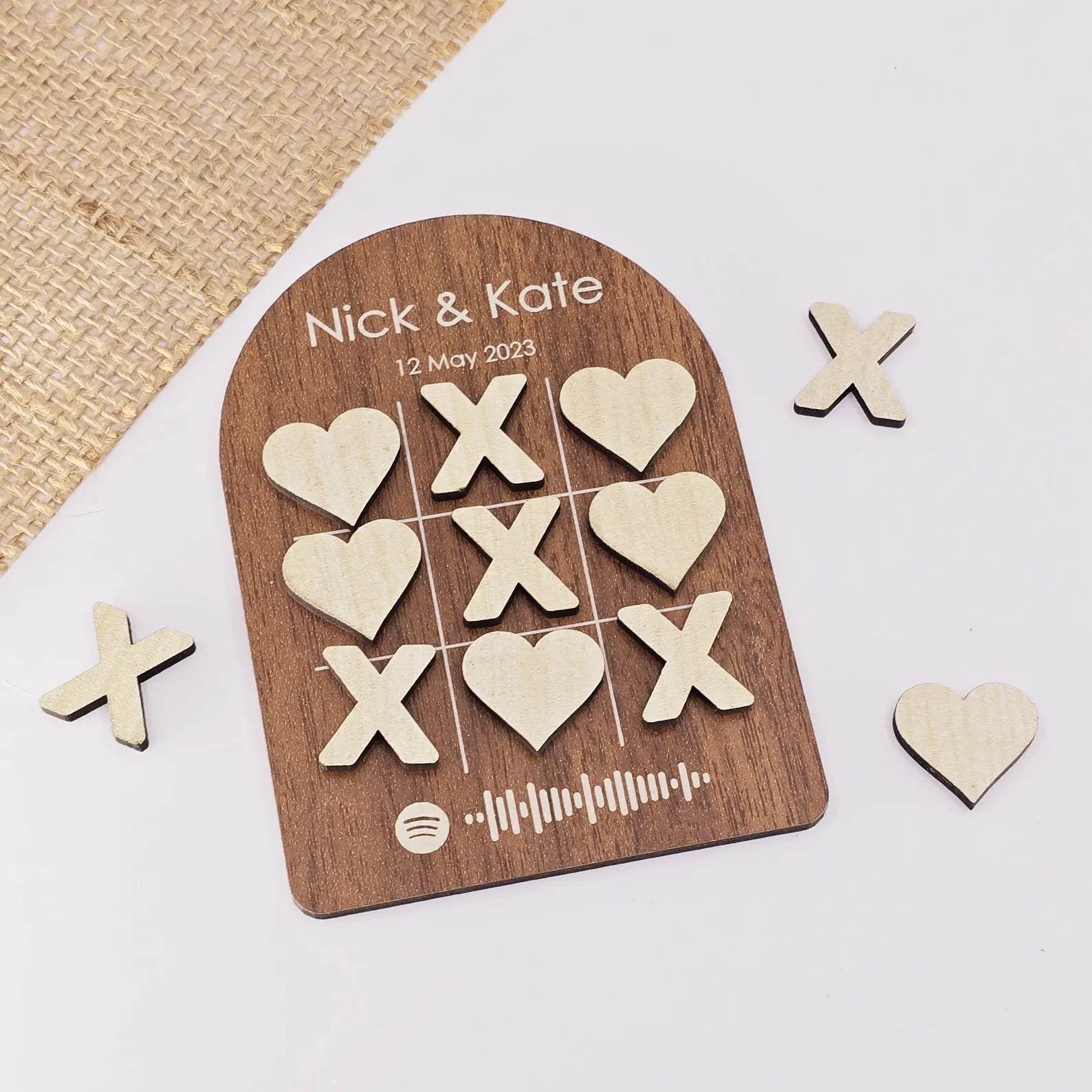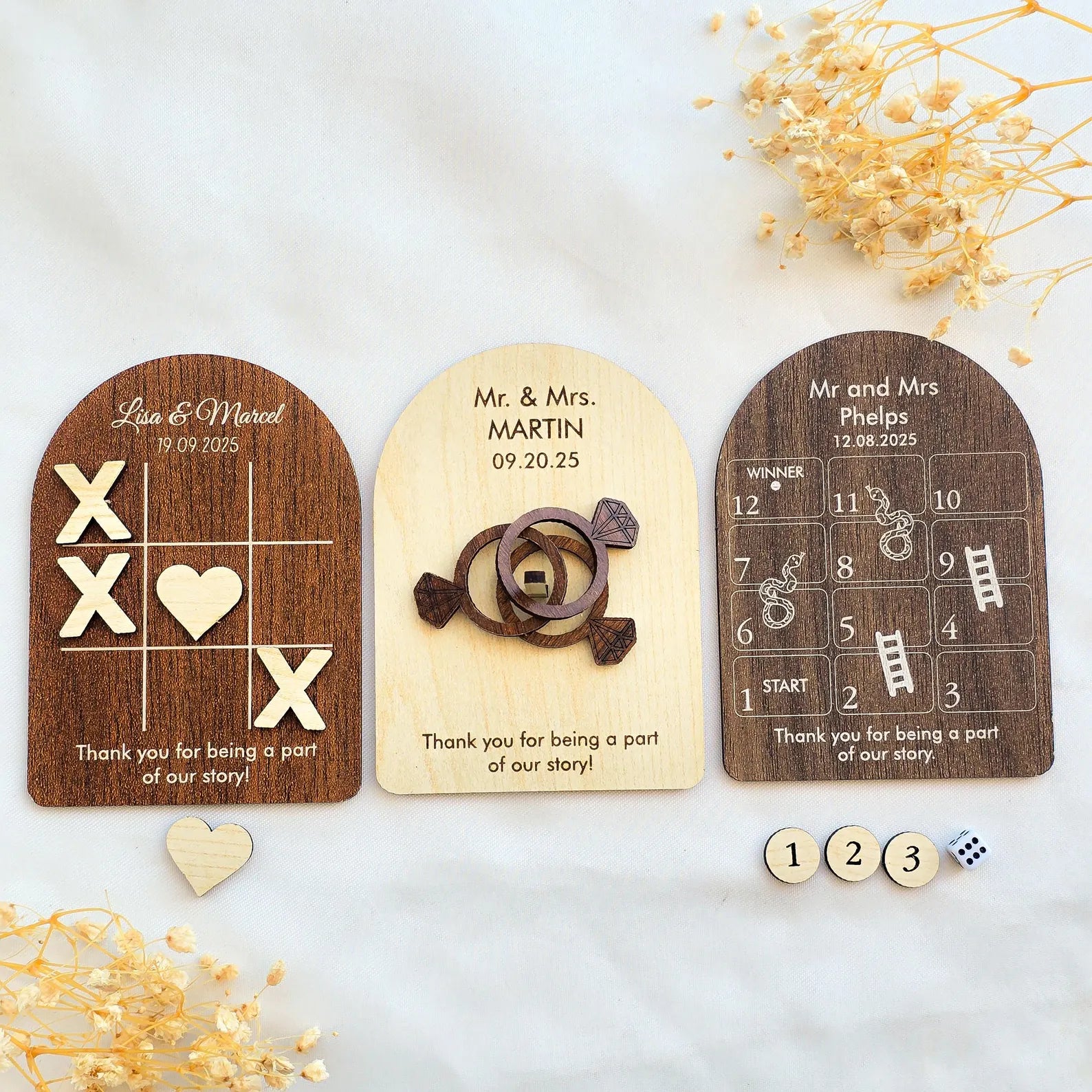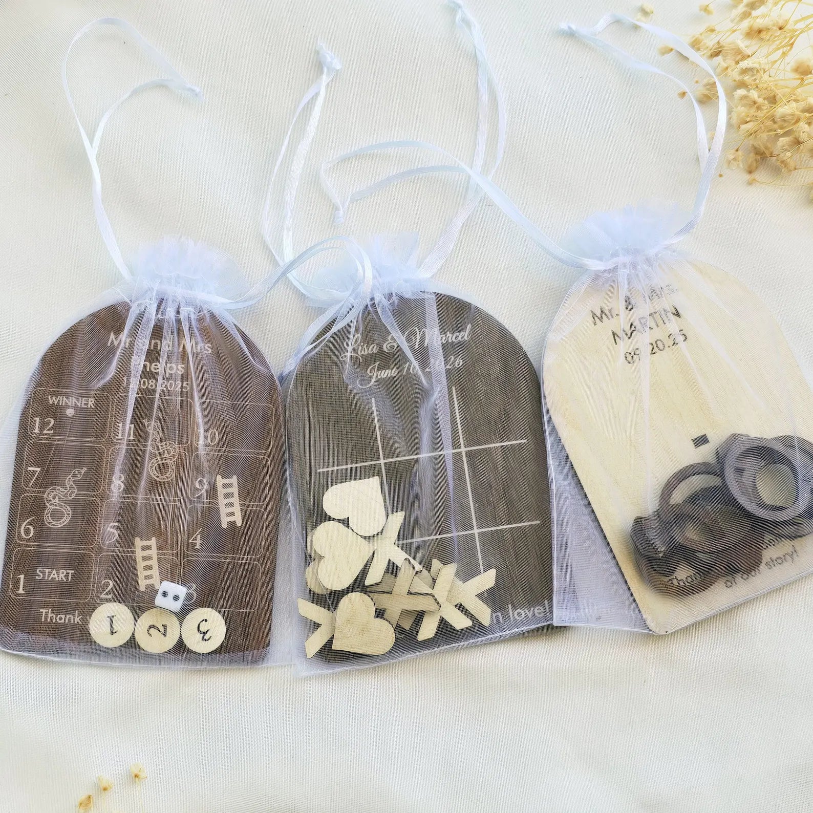 Make your special day unforgettable with our custom wooden table games, designed to add a touch of elegance and fun to your wedding celebration. Pick a single game or mix and match, the games include Tic Tac Toe, Snakes & Ladders and the Ring Toss game, perfect for entertaining your guests and leaving them with a unique keepsake. Each game comes with its pieces carefully packaged in an elegant organza bag, making it ready to gift or display beautifully on guest tables.