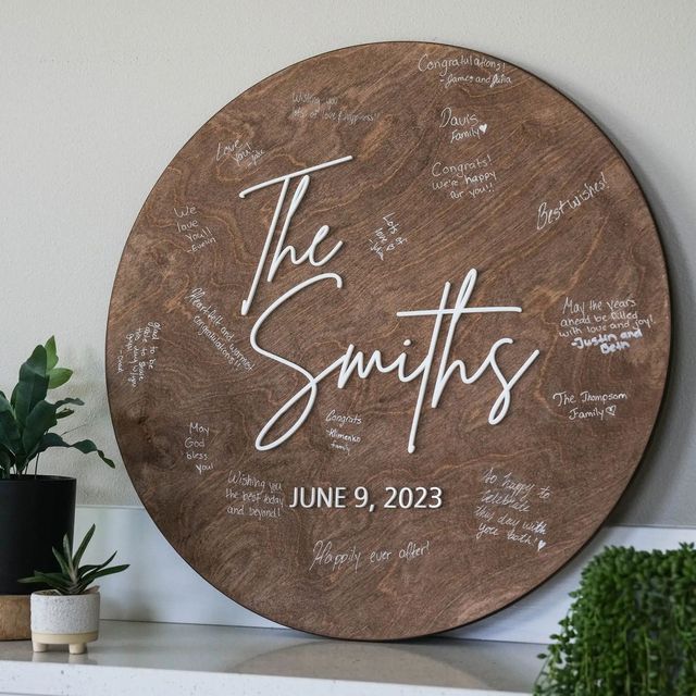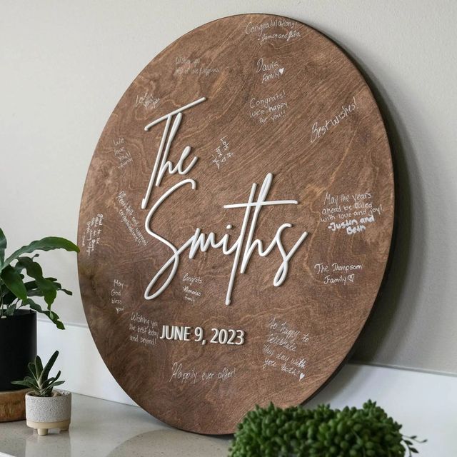 Enhance your wedding decor with our Circular Personalised Wedding Guestbook. A rustic wooden alternative to traditional guest books, crafted from 5mm thick wood and 2mm acrylic text, this stunning piece showcases a hand-drawn script font and 3D lettering. it adds a unique touch to any entryway or reception decor and becomes a timeless keepsake that your family will treasure for years to come. Order yours today to celebrate your special union!