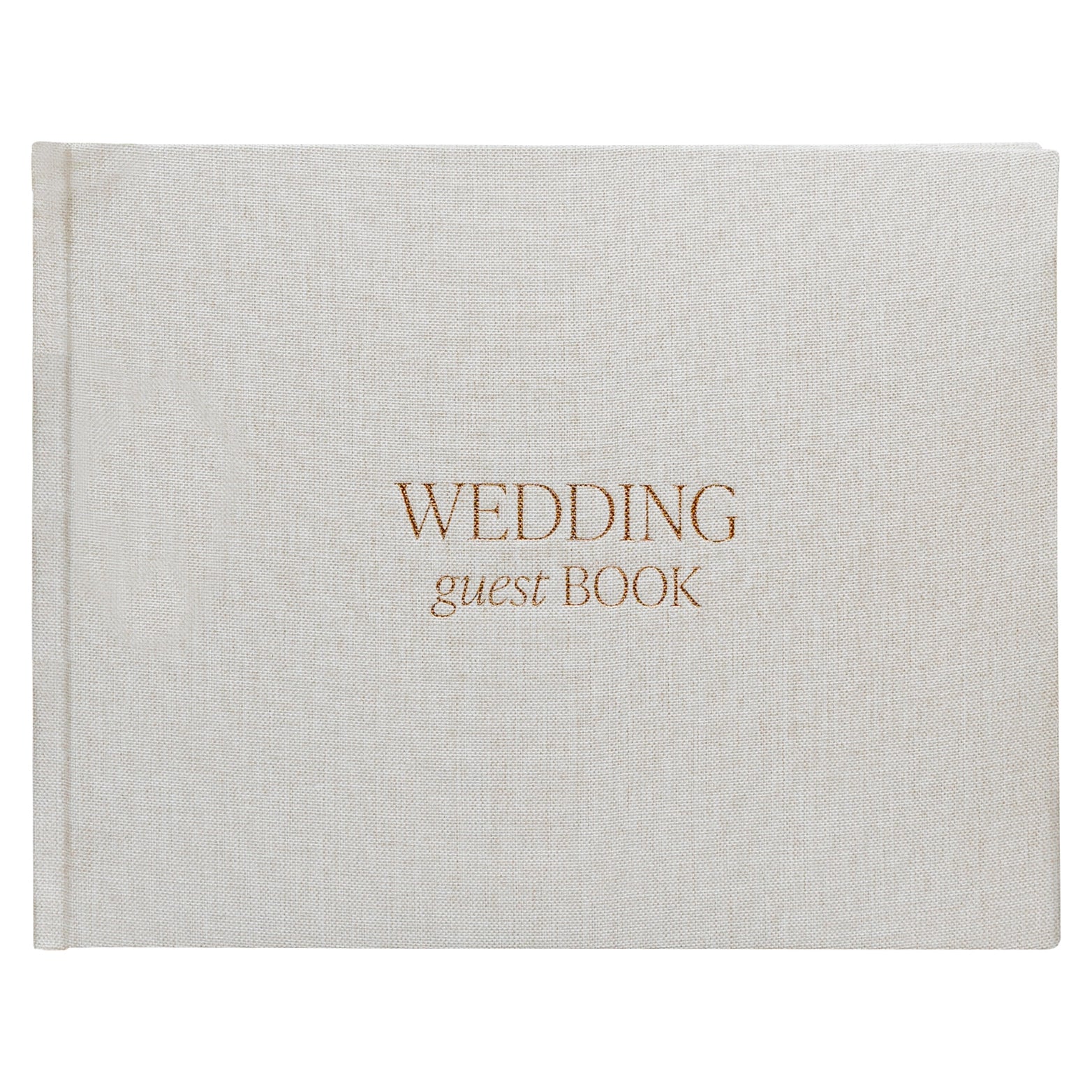 Size: 9.2" x 7.2" • 100 Sheets • 100gsm cream paper • Gold Foil Guest Book Design on Front • Tan Fabric Cover • Ribbon Bookmark in Gold • Unlined Pages