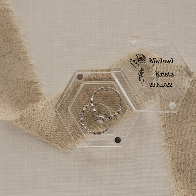 Showcase your rings in style with our elegant hexagon ring box. Measuring just 6.5cm x 5.6cm x 3cm, it's the perfect compact size for travel ensuring it wont get lost. Crafted from durable acrylic, this sleek, transparent box not only protects your rings but also adds a modern touch to your wedding décor. Personalise it with names, surnames, initials or dates for a truly unique keepsake.