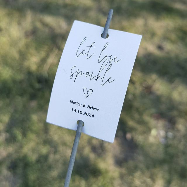 Add a fun and personalised touch to your wedding sparkler send-off with these custom sparkler tags. Perfectly sized to fit your sparklers, these cute tags allow you to include any message you like—whether it's a thank-you note, wedding hashtag, or sweet sentiment. We’ll show you a proof of the artwork before printing, so you can confirm it’s exactly what you want. A charming and memorable detail for your celebration that your guests will love! Sold as a set of 100 customised pieces.